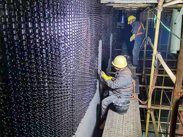 山西柳林循環流化床鍋爐砌筑項目 爐墻耐火磚砌筑 鍋爐內襯抓釘焊接 不定形耐火材料施工效果 耐火材料出現開裂、脫落、···