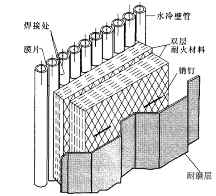 需要敷設(shè)耐磨澆注料區(qū)域還有翼墻管式水冷壁下部,尤其是在管子穿墻處,因?yàn)樵搮^(qū)域的磨損相當(dāng)嚴(yán)重。如圖2所示,對(duì)爐內(nèi)耐火材料較厚的特殊區(qū)域,需要將耐火材料分層澆注。