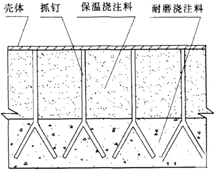 如圖3所示,為耐磨澆注料+保溫澆注料型式,這種結(jié)構(gòu)型式是按一定規(guī)律布置“Y”形抓釘用以固定耐磨襯里,為解決金屬抓釘與耐磨澆注料之間的溫脹差異,抓釘上要涂1mm厚浙青,避免熱態(tài)下由于金屬銷(xiāo)釘與耐火材料的膨脹不同而引起耐火材料的開(kāi)裂,同時(shí)耐磨澆注料需按2%的比例加入不銹鋼纖維,同樣耐磨襯里要留有適當(dāng)膨脹縫。