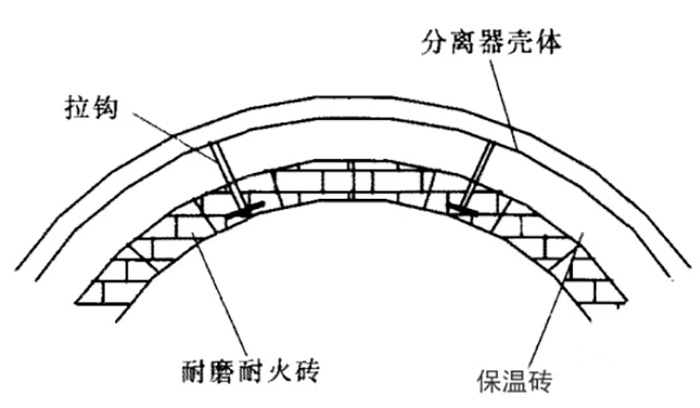 如圖7所示,為分層拉鉤磚結(jié)構(gòu)形式,在分離器的圓筒部分及錐段部分均采取楔形耐磨磚與拉鉤磚配合的這種結(jié)構(gòu),可有效防止耐磨耐火磚的脫落,使任何一塊獨(dú)立的耐磨耐火磚幾乎沒(méi)有可能脫落。