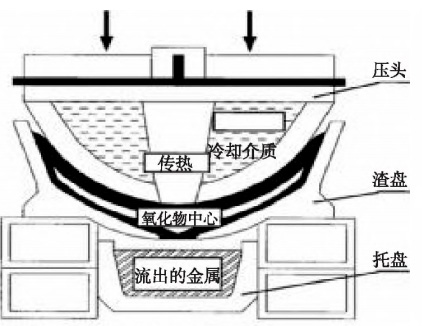 壓榨回收法的工作原理是將熱鋁灰從壓濾機上部裝入,對熱鋁灰施加靜壓或者動壓,將熔融鋁擠壓出。例如SPM法、MADOC法、COMPAL法、Thepress法等,原理如圖2所示。壓頭施加壓力,爐渣內(nèi)的金屬受壓流向下層容器,在此期間鋁灰氧化迅速停止,形成的金屬殼將氧化物包裹起來,這樣既可以控制灰塵,也能減少煙氣的排出,而熱量由循環(huán)冷卻水帶走,爐渣的溫度逐漸降低到450℃以下,防止氧化的二次發(fā)生。