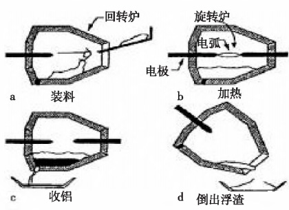 ALUREC法由丹麥阿加公司、霍戈文斯鋁業(yè)公司、曼公司三家公司聯(lián)合開發(fā),流程圖見圖4。主要流程為裝料、加熱、收鋁、倒出浮渣,該法主體設(shè)備為回轉(zhuǎn)式熔化爐,還可以用純氧作助燃劑,升溫速度快,可以有效減少燃燒過程產(chǎn)生的有機氣體,煙塵被煙罩吸收二次利用處理。此法優(yōu)點在于機械化程度較高和運行環(huán)境好;但金屬回收率要比炒灰低,一般在93%左右,且產(chǎn)生的殘余鋁灰還需進(jìn)一步處理。