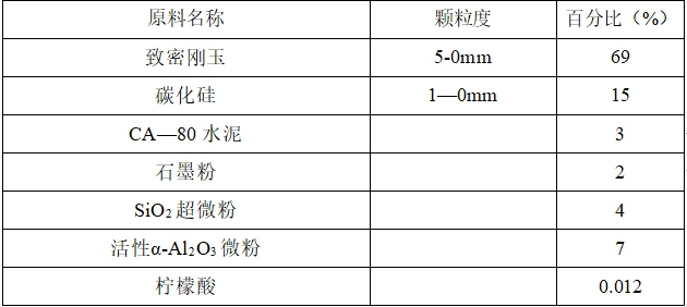 自20世紀70年代開始研制Al2O3—SiC—C質澆注料,隨著不定形耐火材料技術進步,開發了粘土結合、鋁酸鈣水泥結合、硅溶膠結合、ρ-Al2O3結合、磷酸二氫鋁結合等Al2O3—SiC—C質澆注料。加上施工及維修等的技術進步,又開發了免烘烤澆注料、快干型澆注料、自流型澆注料、環保型澆注料等。但始終都是屬于Al2O3—SiC—C質澆注料。代表性的配料見表1。