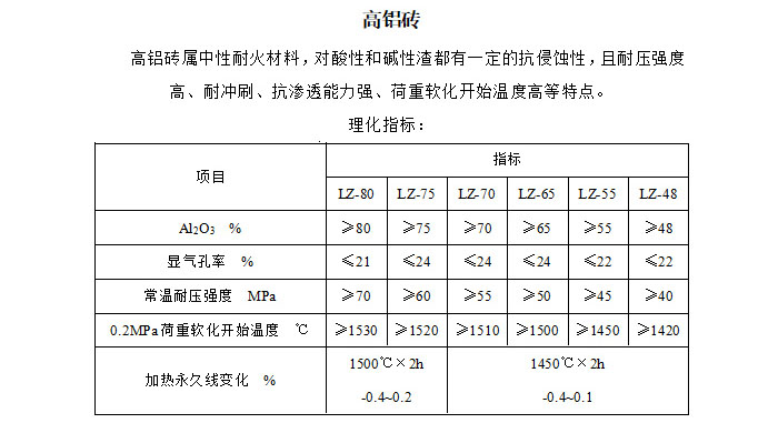 高鋁磚按含鋁量分為四個(gè)等級(jí),三級(jí)含鋁量不低于百分之55,二級(jí)含鋁量不低于65,一級(jí)含量不低于75,特種高鋁耐火磚含鋁量在85以上。至于高鋁磚的形狀,除了標(biāo)準(zhǔn)磚,還有通用型,也叫異型磚,如果形狀非常不規(guī)則的話通常叫做特異型高鋁磚。高鋁磚相關(guān)理化指標(biāo):